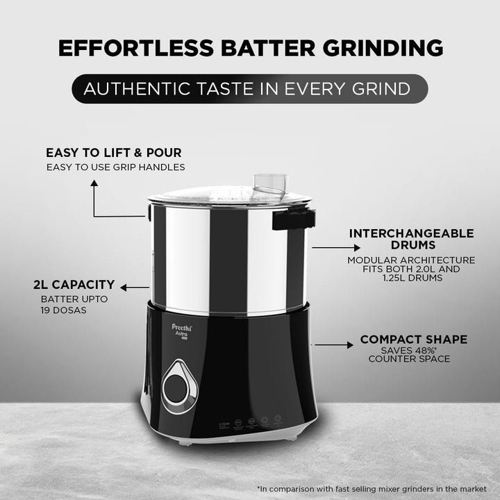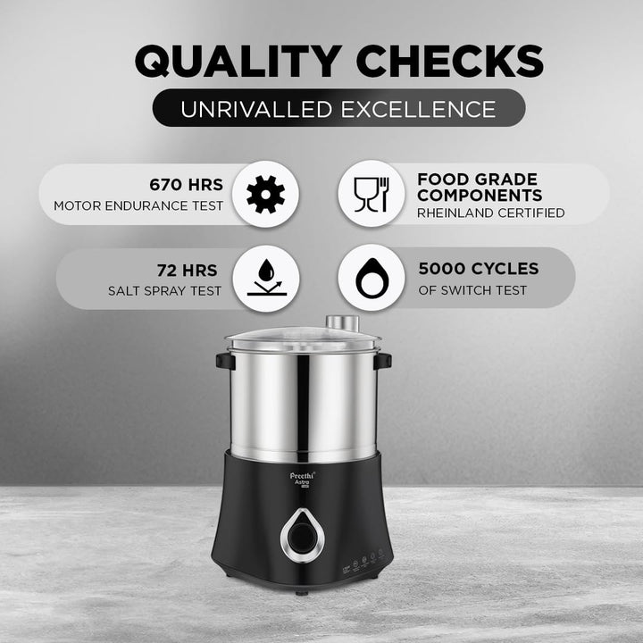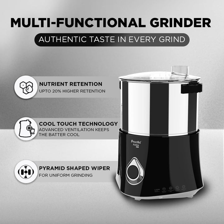 Preethi Astra Expert Wet Grinder|150W 2L Stainless Steel Table Top Wet Grinder with Food Processor|Make South Indian Batter at Home (Black)