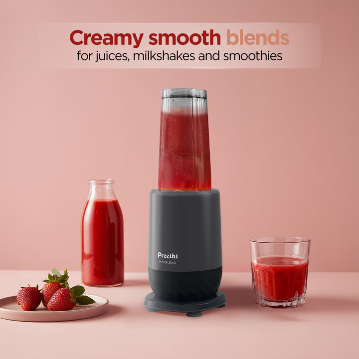 Preethi MiniBlend Compact Food and Juice Blender for Lump Free Purees, Smoothies and Protein Shakes | Razor sharp Ninja blades with 2 Leak-proof Jars , Sipper & Storage Lids | Free Lifelong Service